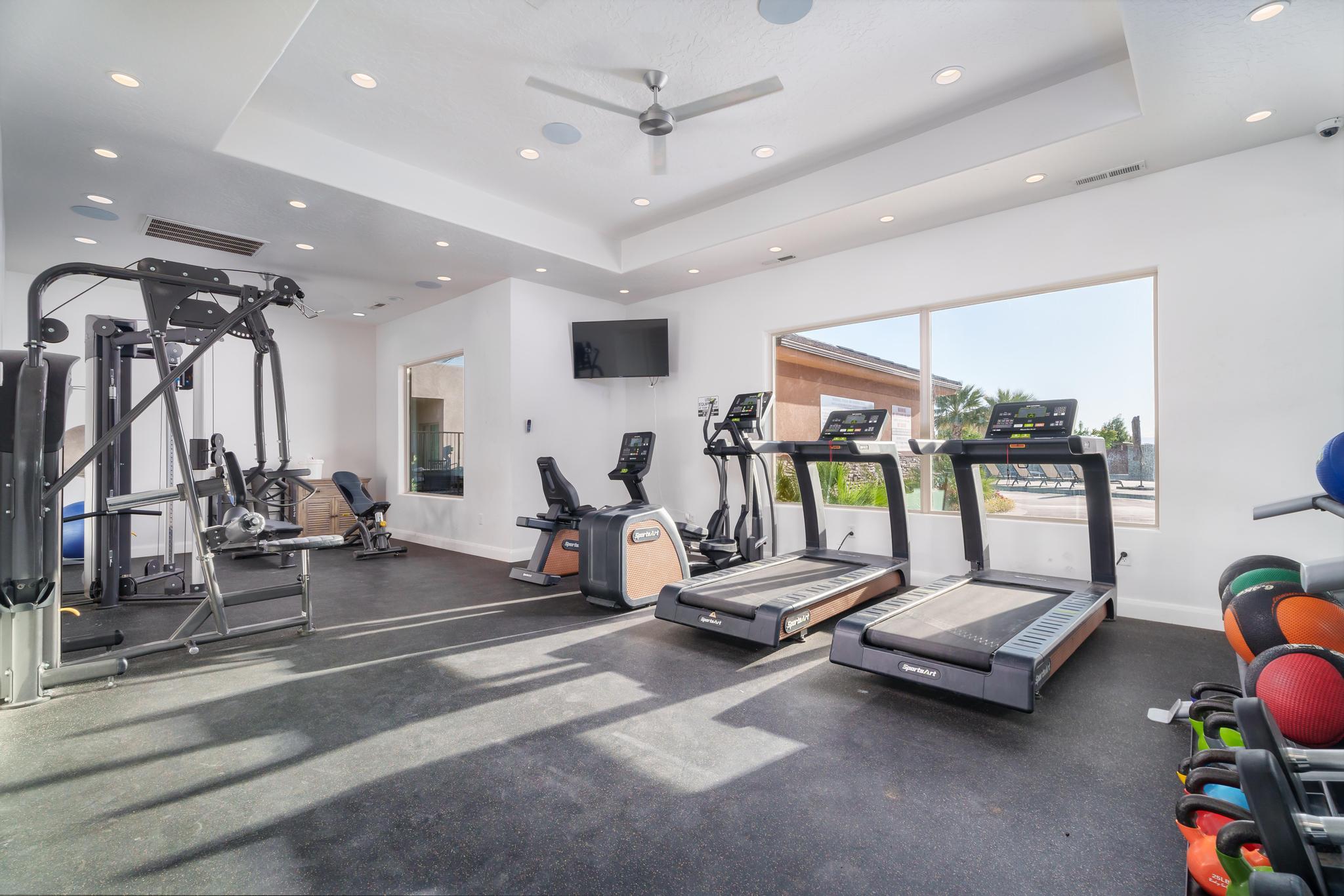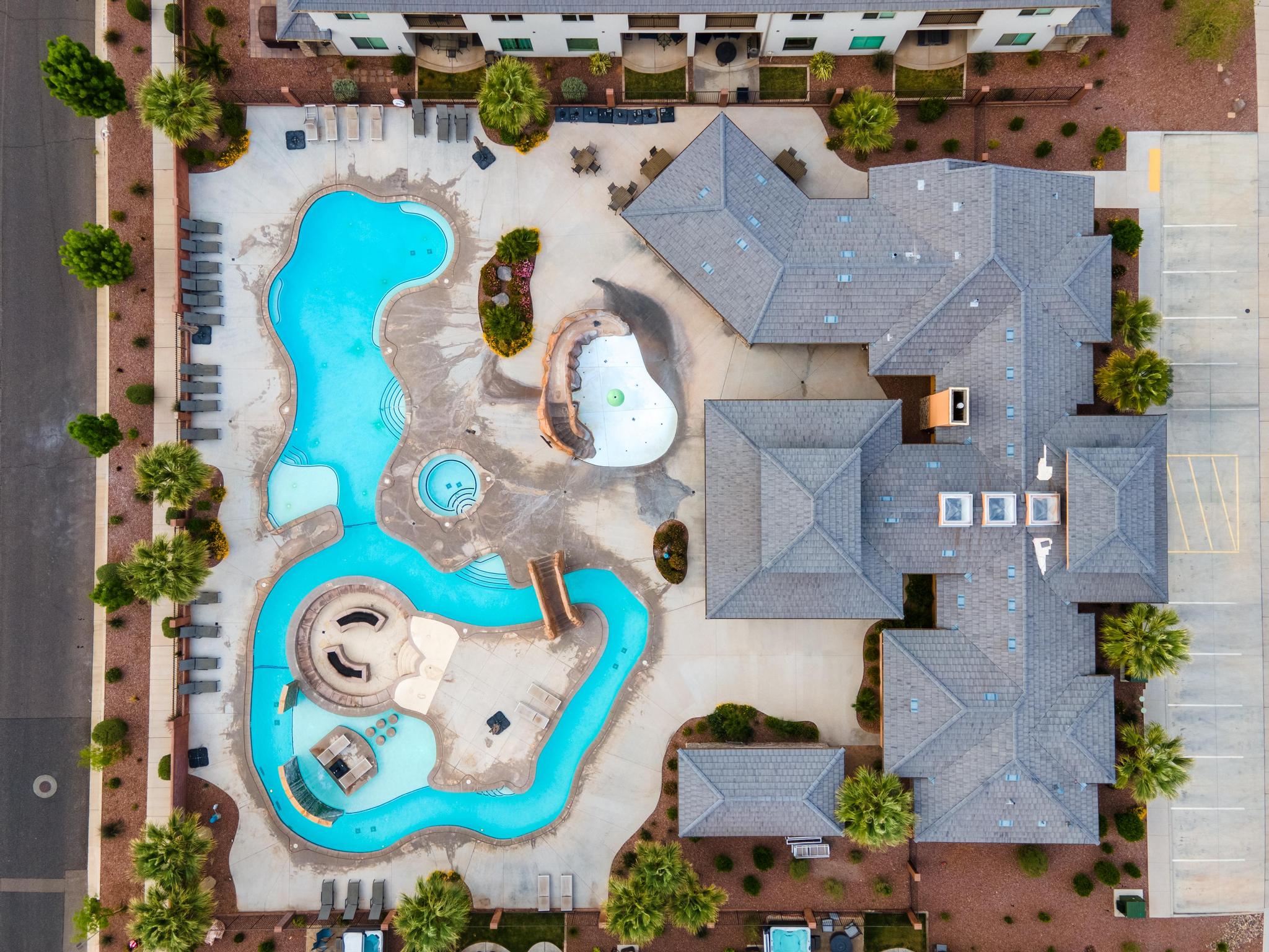 Resort-Style Amenities: Guests at Zion Village Resort can indulge in a year-round heated pool, lazy river, splash pad, hot tub, and a well-equipped clubhouse featuring a gym, game area, and soft seating workspaces.